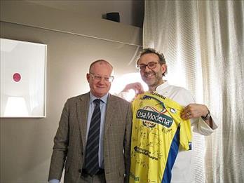 Massimo Bottura, orgoglioso modenese doc, appassionato di sport e di pallavolo, ha ricevuto dal Direttore Generale di Pallavolo Modena Bruno Da Re una maglia di Casa Modena 2010/2011 autografata da tutti gli atleti gialloblù. |