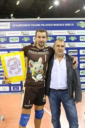 DIDASCALIA DELLA FOTO: Massimo Rinaldi (Socio Titolare de La Piazzetta del Gusto di Nonantola) premia l’MVP di Casa Moena-Tonno Callipo Loris Manià