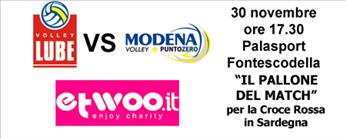 Cucine Lube Banca Marche Macerata: A.S. Volley Lube ed Etwoo.it insieme con “Asta del Match” per sostenere la Croce Rossa nell'impegno per l'emergenza alluvione in Sardegna. In occasione della gara di sabato 30 novembre il "Pallone del Match" tra Cucine Lube Banca Marche e Casa Modena verrà autografato dai giocatori di entrambe le squadre, e verrà poi messo in asta benefica su Etwoo.it – Il Portale Italiano delle aste di beneficenza. L’asta sarà online a partire dai prossimi giorni direttamente nello Store Benefico dedicato alla Lube Volley su www.etwoo.it