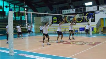 Nella foto, i giocatori della Tonno Callipo Calabria Vibo Valentia impegnati in un’esercitazione a muro