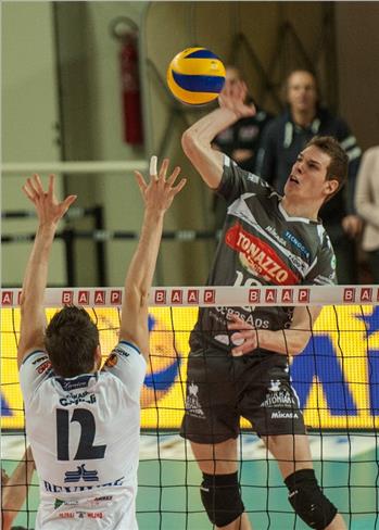Dopo una buona partenza dei veneti, dal 14-13 sono i padroni di casa a prendere il controllo del set guidati dai colpi di Cebulj e Koumentakis (25-19). Nel secondo coach Baldovin cambia le carte in tavola, inserendo Aguillard per Mattei. Il testa a testa prosegue per tutta la durata del parziale, con gli uomini di Kantor a mantenere sempre un minimo di scarto. Entrano in campo anche Beccaro, Milan e Gozzo. Si va così ai vantaggi ma Ravenna chiude 30-28 con Jeliazkov. Nel terzo set i continui capovolgimenti di fronte premiano sul finale i ravennati che danno la zampata finale del 25-22. Da sottolineare la buona prova di Volpato [nella foto] (7 punti, 86% di positività in attacco e 1 muro vincente), mentre Mattei e Aguillard hanno realizzato 3 muri a testa con percentuali inferiori in attacco. Best scorer dei patavini con 14 punti sono stati Rosso (1 ace, 2 muri e 52% in attacco) e Giannotti (1 muro e 43% in attacco).