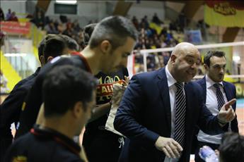 Nella foto, coach Luca Monti dialoga con i suoi giocatori durante un time-out dell’ultima partita di campionato contro la Conad Reggio Emilia (foto Scalamandrè)