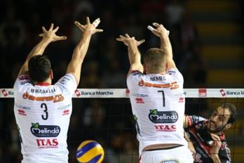 Energy T.I. Diatec Trentino: Civitanova Marche (Macerata), 1 marzo 2015 Il Palasport di Civitanova Marche, nuova casa della Lube, ed i suoi oltre 4.200 spettatori respingono solo dopo cinque set ed oltre due ore di gioco il primo tentativo di assalto da parte dell’ENERGY T.I. Diatec Trentino. La formazione gialloblù questo pomeriggio è infatti uscita sconfitta solo al tie break nel big match del ventunesimo turno di regular season SuperLega UnipolSai contro Treia cedendo al tempo stesso anche il primato in classifica a Modena (vittoriosa in casa con Ravenna e ora avanti di uno) proprio alla vigilia del turno di riposo. Il terzo stop stagionale in campionato non intacca comunque quanto di buono sin qui fatto da Birarelli e compagni in campionato; il prezioso punto conquistato consentirà infatti di tenere a debita distanza la stessa Lube anche dopo aver osservato il turno di riposo in regular season nel prossimo weekend. La trasferta nella Marche può essere archiviata quindi positivamente perché nel corso della gara la squadra di Stoytchev ha dato dimostrazione di non essere salita a caso tanto in alto in classifica; con una grandissima forza di volontà e capacità di adattamento alle varie situazioni che la partita ha creato, i gialloblù sono stati in grado di portarsi due volte avanti, vincendo primo e terzo parziale prima di subire la rimonta dei padroni di casa, guidati dai redivivi Fei (in campo fin dal primo set al posto di Sabbi ed mvp con 21 punti ed il 57% a rete) e Podrascanin. L’allenatore bulgaro nel corso del match ha alternato diversi effettivi trovando ottime risposte in particolar modo da Giannelli, titolare in pianta stabile da metà del secondo parziale ed autore di una prova efficace in cabina di regia al posto di Zygadlo, e Nelli (4 punti). Alla giovane diagonale palleggiatore-opposto non sono tremate le mani nel momento più difficile, ma pur poggiandosi sui loro spunti, Trento a gioco lungo ha dovuto inchinarsi all’efficacia a rete di Kurek e alla giornata a corrente alternata degli attaccanti di posto 4 Kaziyski e Lanza (comunque decisivi nei due set vinti). Best scorer dell’ENERGY T.I. Diatec Trentino l’opposto Martin Nemec con 18 punti (di cui 3 a muro e uno al servizio) ed autore di una prova pressoché perfetta nei primi tre parziali. La cronaca della gara. Gli starting six non offro particolari novità rispetto a quanto preventivato alla vigilia: Radostin Stoytchev sceglie la consueta formazione titolare per la sua ENERGY T.I. Diatec Trentino schierando Zygadlo in regia, Nemec opposto, Kaziyski e Lanza schiacciatori, Birarelli e Solé al centro, Colaci libero; la Cucine Lube Banca Marche presentata da Alberto Giuliani prevede invece Baranowicz al palleggio, Sabbi opposto, Kurek e Parodi in posto 4, Podrascanin e Stankovic centrali, Henno libero. L’avvio di partita è tutta nel segno degli ospiti che approfittano di una Lube molto fallosa a rete (tre errori fra Kurek e Sabbi) per scappare sul 7-4. Giuliani interrompe subito il gioco ma alla ripresa è ancora Trento con due break point di Kaziyski ad allungare ulteriormente sull’11-7. Il tecnico dei cucinieri allora inserisce Fei per un Sabbi fuori giri, ma la musica non cambia perché Trento concede poco agli avversari (15-12, 18-14) grazie ad una buona continuità nella propria fase di cambiopalla. Un errore di Lanza sembra poter riportare nel match i locali (22-20); i gialloblù fiutano il pericolo e ripartono con Birarelli (attacco e muro su Podrascanin per il 24-20), chiudendo poi sul 25-21. Il buon momento trentino continua anche nel secondo set: Nemec e gli errori della Lube spingono l’ENERGY T.I. Diatec Trentino sul 4-1 prima e poi sull’8-4 dopo che Parodi da solo in attacco aveva provvisoriamente ricomposto lo strappo sul 4-4. Giuliani corre nuovamente ai ripari inserendo Kovar per lo stesso Parodi, incappato in due errori consecutivi a rete, ma Trento è un treno lanciato e con lo slovacco in attacco vola sino al +5 (12-7). Dopo il time out tecnico arriva la reazione della Lube, guidata da Kurek che proietta i suoi sino al 14-12; Stoytchev ferma tutto per riordinare le idee ma la tendenza del parziale è cambiata. I padroni di casa impattano infatti con Fei sul 14-14 e poi scappano via approfittando dei problemi in ricezione di Kaziyski e Lanza (14-18). L’allenatore bulgaro allora avvicenda Giannelli a Zygadlo e poi successivamente Fedrizzi a Kaziyski senza ottenere i risultati sperati (18-22): Treia non lascia più nulla e trascinata da Kurek si porta in parità sull’1-1 col 19-25 chiuso proprio dal polacco. Nel terzo set in cabina di regia per l’ENERGY T.I. Diatec Trentino c’è ancora Giannelli, confermato in campo da Stoytchev: la mossa dà i suoi frutti, visto che i gialloblù scattano dai blocchi di partenza con un ottimo piglio (4-1, 8-6, 12-9), sorretti da una buona fase in cambiopalla e da un muro in cui Birarelli torna a fare la voce grossa. Il bolzanino trova in Nemec e Kaziyski due punti fermi per l’attacco, tant’è vero che grazie al duo di palla alta Trento scappa via sul +4 (19-15); la Lube prova a replicare con Fei (22-20, time out Stoytchev). A Giannelli però non tremano le mani, trova anche un ace per il 24-20, che poi Lanza trasforma in 25-21. L’avvio di quarto set vede Trento ancora molto attiva in fase di break point (4-2), ma la Lube opera il controsorpasso ben prima del time out tecnico (5-9, 10-12) anche approfittando di un piccolo infortunio alla mano sinistra di Lanza (sostituito per un paio di scambi da Fedrizzi). Quando Pippo rientra però i gialloblù tornano subito a ridosso degli avversari (11-12); è solo un attimo però perché poi a muro si scatena Podrascanin che riapre il margine (11-16). Il time out di Stoytchev sortisce qualche effetto (15-18, due punti di Lanza), poi l’allenatore bulgaro inserisce Mazzone, Nelli e Burgsthaler e la squadra lotta come un leone sino al punto del pareggio (22-22), propiziato da un ottimo turno al