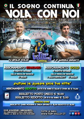 Ninfa Latina: Prende il via la campagna abbonamenti per la stagione 2015-16 della Top Volley. Molte le novità di quest’anno. La prima riguarda un “abbonamento gold” a 300 Euro per l’intera stagione con l’accesso alla sala ospitality. L’abbonamento “standard” intero invece è di 100 euro e il ridotto (da 11 a 16 anni a 50 euro e over 65 a 70 euro) per tutte le partite della stagione regolare.
