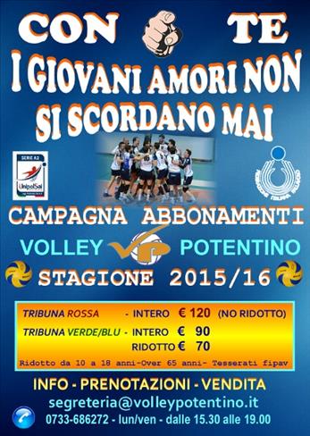 Volley Potentino Potenza Picena: "CON TE I GIOVANI AMORI NON SI SCORDANO MAI”. Al PalaPrincipi di Potenza Picena si respira già aria di grande pallavolo con la campagna abbonamenti del Volley Potentino avviata per il prossimo campionato di Serie A2 UnipolSai.