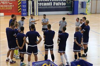 Nella foto: Coach Romano Giannini con squadra e staff riuniti nei primi giorni di allenamento al Pala Coopersport di Chiusi