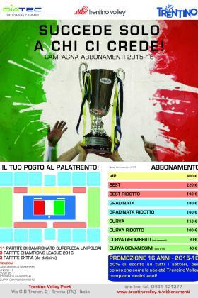 Diatec Trentino: Trento, 18 settembre 2015 A quaranta giorni dall’esordio in SuperLega UnipolSai 2015/16, la Campagna Abbonamenti “Succede solo a chi ci crede!” fa segnare un ottimo dato di adesioni. Dopo le prime due settimane di vendita libera, successive al periodo di prelazione, il numero di tessere sottoscritte ha infatti toccato quota 1.300. La quota 2015/16 verrà sicuramente incrementata nelle prossime settimane, ma quella attuale dimostra già perfettamente come l’entusiasmo dei tifosi della Diatec Trentino Campione d’Italia sia sempre elevato; solo negli ultimi dieci giorni sono stati 150 gli abbonamenti venduti. La Campagna Abbonamenti resterà attiva sino a metà novembre; è possibile acquistare la propria tessera presso la sede del Trentino Volley Point (a Trento, vicino al Bren Center, in Via G.B. Trener 2) tutti i giorni dal lunedì al venerdì dalle ore 8 alle 12 e dalle 14 alle 18. Per maggior informazioni: www.trentinovolley.it/abbonamenti Trentino Volley Srl Ufficio Stampa |