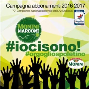 Monini Spoleto: Con l’hashtag #iocisono si apre ufficialmente la campagna abbonamenti della Monini Marconi Spoleto per la Serie A2 UnipolSai 2016/2017. A partire da lunedì 5 settembre tutti i tifosi e gli appassionati di volley avranno l’opportunità di acquistare le tessere che assicureranno un posto riservato al Palarota nelle 14 partite casalinghe della stagione (sono esclusi la Coppa Italia e gli eventuali playoff) ad un prezzo molto vantaggioso. 100 euro per l’abbonamento intero, 50 euro per quello ridotto, destinato ai giovanissimi dai 12 ai 18 anni e agli adulti sopra ai 65. C’è poi una terza opportunità, quella del pacchetto family: le 14 partite a 150 euro per 2 adulti di una stessa famiglia.