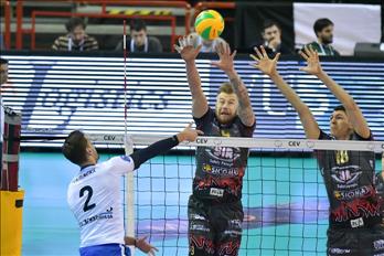 Nella foto: una fase del match d'andata con Zaytsev e Podrascanin a muro su Tuerlinckx
