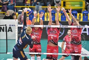 Nella foto: Il muro a tre di Perugia contro Kovacevic nel match d'andata