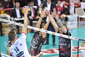 Nella foto: Zaytsev e Podrascanin a muro su Stokr nel match di regular season al PalaEvangelisti