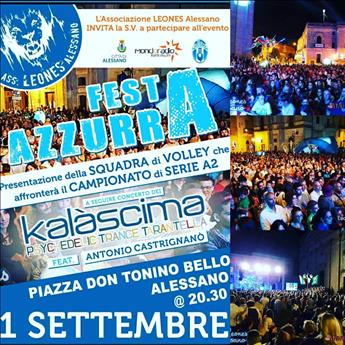 Aurispa Alessano: Tutto pronto! I "Leones" stanno ultimando i preparativi per la Festa Azzurra che, con il passare degli anni, è diventato l'evento dell'estate alessanese. L' Associazione, oltre ad organizzare la festa, si occupa anche di attività di decoro urbano dando così una mano concreta all'Amministrazione Comunale. Anche quest'anno, dopo la presentazione ai tifosi della squadra, a "riscaldare" la serata ci saranno i Kalascima, potente band di contaminazione della pizzica, oltre che a tutti gli effetti facenti parte della grande famiglia Azzurra. Ad accompagnarli sul palco Antonio Castrignanò, voce storica della Notte della Taranta. Prima della festa la squadra sarà ricevuta nell'aula consiliare dall'Amministrazione Comunale con i testa la sindaca Avv. Francesca Torsello. Area Comunicazione Pallavolo Azzurra Alessano |