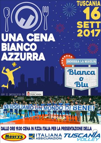 Maury's Italiana Assicurazioni Tuscania: Uno dei ricordi più belli della scorsa stagione pallavolista è la dichiarazione d'affetto della squadra ai suoi tifosi e proprio da questo vogliamo ripartire. La sera del 16 settembre, in piazza Italia a Tuscania, ci sarà la tradizionale cena con presentazione del Tuscania Volley 2017/2018. L'idea per questo evento è quella di colorare il paese con i colori della nostra società, il bianco e l'azzurro (ma anche blu va più che bene). Si è pensato ad un dress code per chiunque voglia partecipare a questa cena sotto le stelle. Basta indossare una maglia o una camicia o un vestito o altro capo di abbigliamento, che sia dei colori che ci rappresentano, bianco o azzurro (blu). Mostriamo l'affetto che i nostri tifosi hanno per i nostri atleti. Il programma della serata prevede una cena in piazza con accompagnamento musicale ed a seguire la presentazione della serie A del Tuscania Volley con ospiti ed intrattenimento. Durante la serata sarà presente uno stand per acquistare l'abbonamento per la stagione 2017/2018, infatti a breve partirà la campagna abbonamenti che, senza svelare troppo, darà ai sottoscriventi dei vantaggi speciali. Per tutte le informazioni del caso basta rivolgersi al Bar Centrale ed ai nostri addetti ai lavori sempre disponibili. Non resta che attendere impazienti questa serata bianco-azzurra. Dania Spinosi, Giancarlo Guerra - Ufficio Stampa Tuscania Volley |