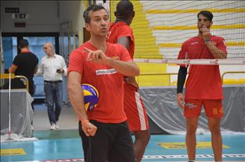 Nella foto, un primo piano di coach Lorenzo Tubertini durante una seduta di allenamento (foto www.volleytonnocallipo.com)