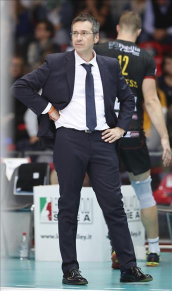 Nella foto, un primo piano in panchina di coach Lorenzo Tubertini (foto Lega Volley)