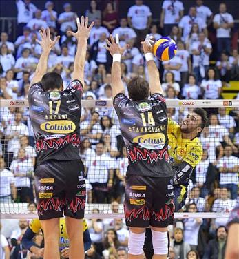 Zaytsev per Russell e Podrascanin per Ricci entrano per la Sir che subito riconquista il cambio palla, 5-8. Moreira a muro chiude su Atanasjevic, 6-11; Castellana si diverte e fa bene. Canuto mantiene le buone percentuali di attacco confortato anche da Cazzaniga. Arriva anche l'ace di Paris ed il secondo tempo perugino, 13-18; Atanasjevic picchia sempre in attacco ma la Bcc non si scompone; la difesa tiene con Cavaccini e Canuto e l'attacco della Sir deve fare gli straordinari per mettere palla a terra, 17-21; sempre Canuto tiene lontana Perugia, 20-22, Il finale di set è diluito oltre modo per via delle decisioni elettroniche; la battuta float di Canuto mette in difficoltà la ricezione umbra guadagnadosi portandosi con merito ad un passo dal secondo set , 24-20. Moreira ne spreca uno in contrattacco poi il servizio dei Atanasjevic, anche con l'aiuto del nastro, riporta la Sir in parità, 24-24. Si lotta su ogni azione con la Bcc che si guadagna altri 3 set point che l'oppostone di Perugia annulla sistematicamente ; ed è il serbo l'assoluto protagonista del finale capace di chiudere anche la prima opportunità set che i padroni di casa si costruiscono grazie la muro di Anzani su Moreira. Il numero uno umbro mette a terra il contrattacco che punisce una buonissima New Mater che avrebbe meritato sicuramente di più, 29-27.