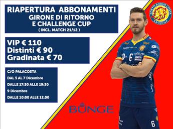 Le tessere potranno essere sottoscritte oggi pomeriggio, giovedì 7 dicembre, dalle ore 17.30 alle 19.30, e nella mattinata di sabato 9 dicembre, dalle ore 10 alle 12, all’interno del PalaCosta, e daranno la possibilità di assistere alle sei gare del girone di ritorno di Superlega più le gare di Challenge Cup (eventuale finale esclusa), a partire da quella contro il Gentofte del 21 dicembre