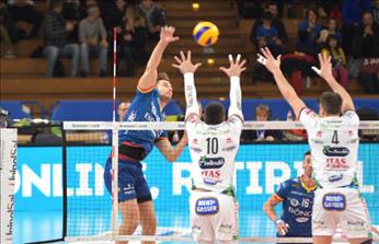 Primo set Il primo break è di Lanza, che mette a terra la palla del 3-1, seguito da una fase caratterizzata dall’equilibrio spezzata da una schiacciata di Buchegger fuori di un soffio, “pizzicata” dal videocheck: 11-8 e time out Soli. L’ace di Eder porta a quattro le lunghezze di vantaggio dei trentini (12-8), Georgiev risponde dalla linea di battuta (12-10), ma la Diatec scappa con Teppan e il muro di Kozamernik: 17-11. Il “doppio” di Giannelli riduce il gap (18-14), Teppan e Hoag al servizio ricacciano però indietro i ravennati (23-15), che non si arrendono e, approfittando degli errori dei padroni di casa, piazzano un break di 3-0: 23-18. Trento si riorganizza e al primo set ball passa in vantaggio con Lanza: 25-18.