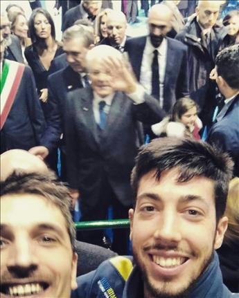 Fra questi i più reattivi sono stati senz'altro capitan De Togni e Federico Rossatti, immortalatisi in un selfie (allegato) che, per quanto di discutibile qualità, ritrae il Presidente Mattarella che saluta proprio la zona in cui erano seduti atleti , tecnici e dirigenti della New Mater.