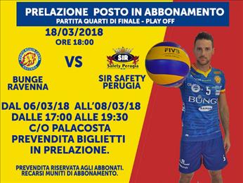 In vista della sfida dei quarti playoff del 18 marzo tra Bunge e Sir Safety Conad oggi, giovedì 8 marzo, è l’ultimo giorno utile per gli abbonati per esercitare il diritto di prelazione per acquistare il biglietto e mantenere il posto